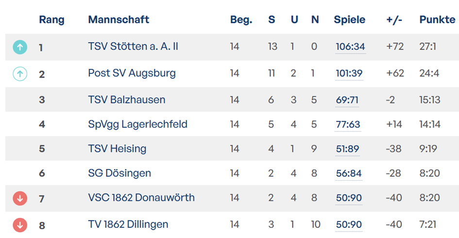 Am Samstag, den siebten März, fuhr unsere erste Damenmannschaft zum TV 1862 Dillingen. Becht und X. Trauter glänzten im Doppel und in ihren Einzelspielen. Im hinteren Paarkreuz mussten Trometer und Heiß kämpfen. Trometer holte im vierten Satz einen Punkt gegen Kreuzer, während Heiß in den Einzeln jeweils im fünften Satz leer ausging. Die Stammspielerinnen holten sich einen Gesamtsieg mit 4:6 nach Hause.
