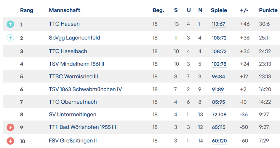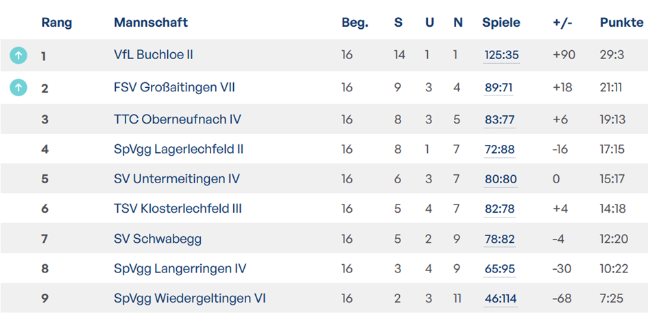 Das letzte Punktspiel fand beim TTC Oberneufnach IV statt. In dieser Partie sah es diesmal anders aus. Gröver, Weiser, Berndt und Franke holten Punkte in ihrem Doppel. Im vorderen Paarkreuz ließen Berndt und Gröver nichts anbrennen. Sie holten vier Punkte. Weiser wollte ebenfalls einen Punkt und holte sich diesen gegen Baumgartner im vierten Satz. Am Schluss gab es einen 3:7-Sieg für Lagerlechfeld.